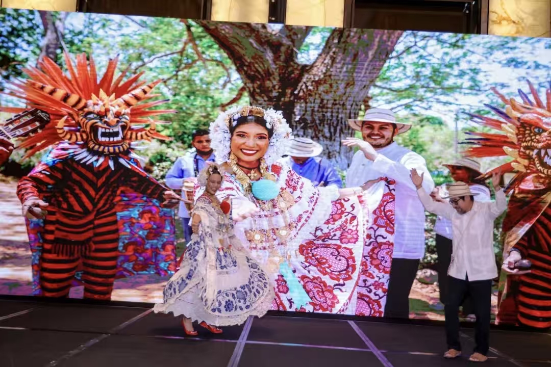 庆典正式开始,充满本土风情的传统舞蹈表演惊艳登场,舞者们身着色彩斑斓的民族服饰,用灵动的舞姿展现着巴拿马的文化魅力。表演间隙,六轮精彩抽奖穿插进行,现场掌声与欢笑声此起彼伏,氛围轻松愉悦。