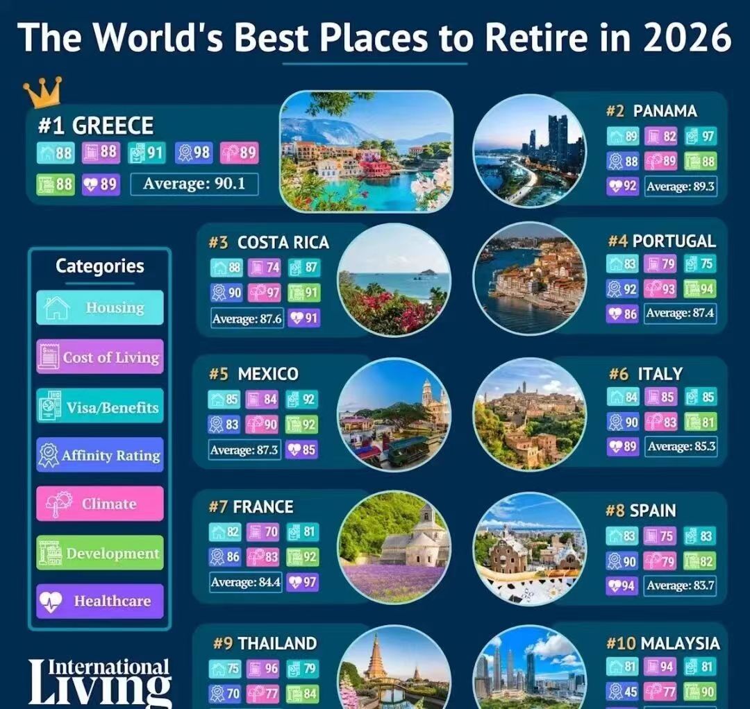 近来,全球知名权威生活杂志《国际生活》(International Living)最新发布的2026年全球退休指数榜单震撼揭晓:希腊力压葡萄牙、西班牙等传统国家,荣登全球最佳养老目的地榜首!