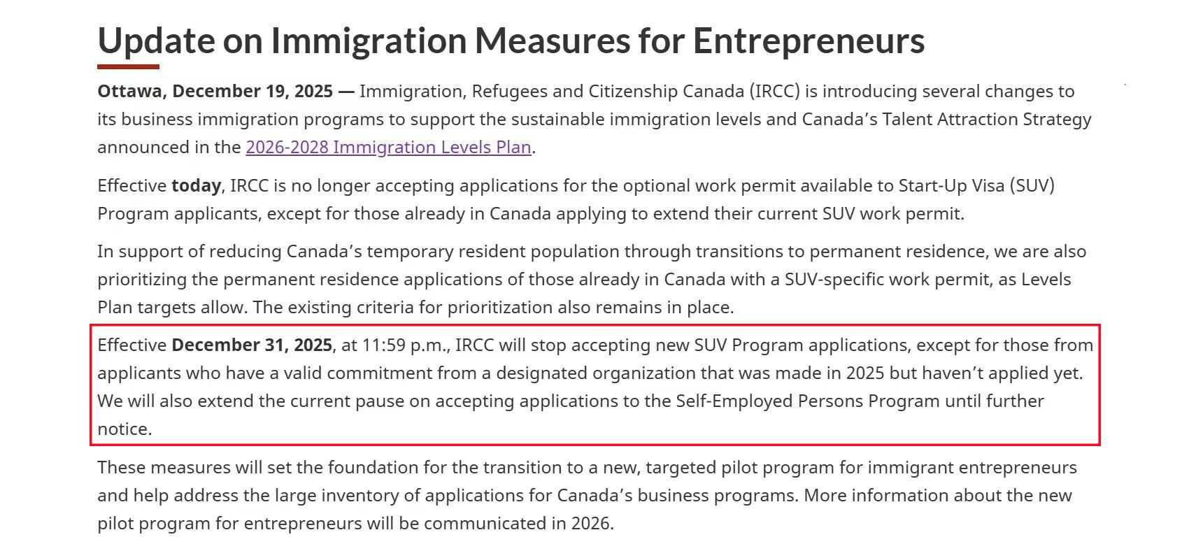 自2025年12月19日起,IRCC已不再接受任何新的SUV项目工签申请,但已在加拿大境内申请延长现有SUV工作许可的申请人除外。