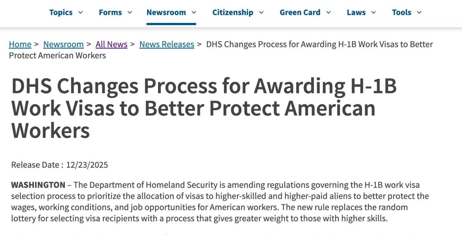 在开始今天的正题前,侨联君先来为大家分享一则重磅消息,美国国土安全部(DHS)官宣正式修改H-1B工作签证抽签规则。