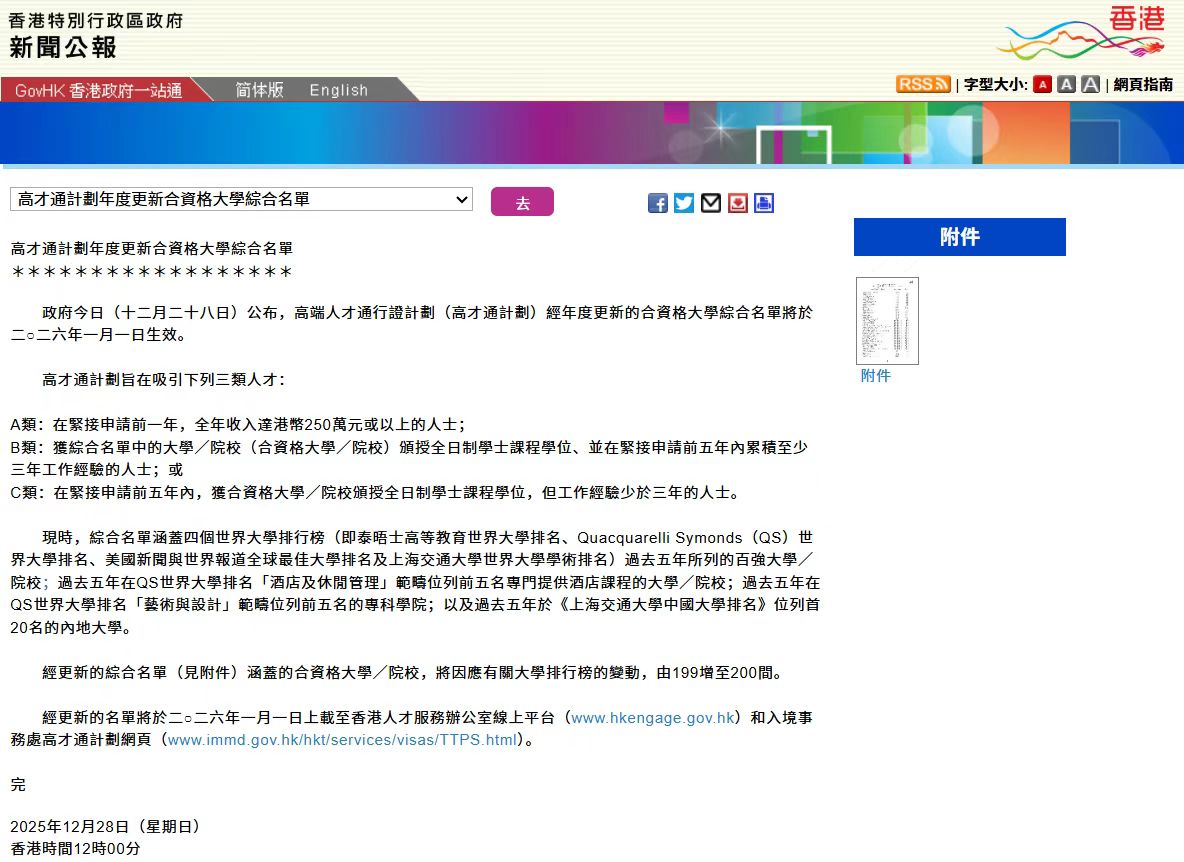 新增5所合资格大学 Adelaide University(澳洲·阿德莱德大学 ) University of Vienna(奥地利·维也纳大学 ) Karlsruhe Institute of Technology(德国·卡尔斯鲁厄理工学院)(KIT) Politecnico di Milano(意大利·米兰理工大学 ) King Fahd University of Petroleum & Minerals(沙特阿拉伯·法赫德国王石油与矿业大学) 但也有4所合资格大学被踢出局,其中有三所来自法国 Ecole Polytechnique(法国·巴黎综合理工学院 ) Université Grenoble Alpes(法国·格勒诺布尔-阿尔卑斯大学) Universite Sorbonne Paris Cite-USPC(法国·索邦巴黎西岱大学 ) University of Freiburg(德国·弗赖堡大学) 内地23所合资格大学数量维持不变,分别是: 清华大学,北京大学,复旦大学,浙江大学,上海交通大学,中国科学技术大学,中山大学,南京大学,华中科技大学,武汉大学,西安交通大学,哈尔滨工业大学,中南大学,四川大学,北京航空航天大学,东南大学,北京理工大学,同济大学,中国人民大学,北京师范大学,南开大学,天津大学,中国科学院大学。 申请人持有以上高校学士学位的人士,仍能申请香港高才B类或C类,进而直接取得香港身份。 值得注意的是,此次综合名单涵盖了4个世界大学排行榜过去五年所列的百强大学/院校: 泰晤士高等教育世界大学排名,QS世界大学排名,美国新闻与世界报道全球最佳大学排名及上海交通大学世界大学学术排名。 过去五年在QS世界大学排名“酒店及休闲管理”范畴位列前五名专门提供酒店课程的大学/院校;过去五年在QS世界大学排名“艺术与设计”范畴位列前五名的专科学院;以及过去五年于《上海交通大学中国大学排名》位列首20名的内地大学。 有意向申请高才B类或C类的朋友们,赶紧查阅下自己的毕业院校是否在更新后的综合名单里吧,以免错过最佳申请时机! 02 香港高才通最新申请要求 高才A类申请 香港高才A类面向的是“高收入人才”,其要求申请人在申请前12个月的收入达250万港币或以上,可通过公司利润或个人收入进行申请。 不过需注意的是,香港高才A类认可的250万港币全年收入,实则是指应课税的就业或业务收入,具体包括薪金、津贴、股票期权及从其拥有的公司所得的利润,由个人投资所产生的收入不会计算在内。 高才B类申请 申请人获综合名单中的大学/院校颁授的全日制学士课程学位,并在紧接申请前5年内累积至少3年工作经验的人士。 高才C类申请 申请人在紧接申请前5年内,获综合名单中的大学/院校颁授的全日制学士课程学位,但工作经验少于3年的人士。 不过这类申请受年度配额限制,且以先到先得的方式分配,所以符合条件的申请人可尽早提交申请哦。 03 关于香港高才通申请常见问答 Q1 本科不符合高才综合名单大学/院校毕业,但硕/博符合,能申请高才B类或C类吗? 不可以。据入境事务处官网表明,申请高才通B/C类,须持有合资格大学/院校颁授的全日制学士课程学位,不看硕士学位或者博士学位。 Q2 专升本学历能申请高才通B\C类吗?