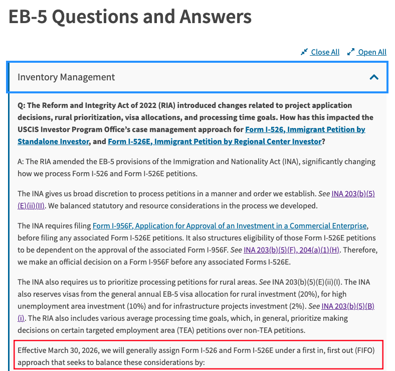 此外,其还宣布,自2026年3月30日起,其将普遍采用 “先到先审”(FIFO)原则,来分配I-526和I-526E的审理顺序,以平衡以上各项要求。