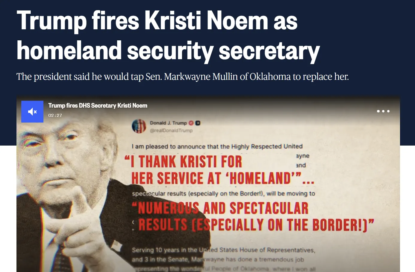近日,川普政府在社交媒体上官宣,免去Kristi Noem国土安全部长职务,由来自俄克拉荷马州的参议员Markwayne Mullin接任,预计将于3月31日起生效(前提是参议院确认后)。