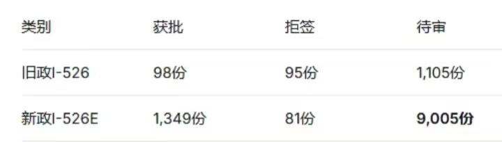 根据数据显示,新政I-526E的批准量高达1349份,拒签81份,审结总量为1430份。