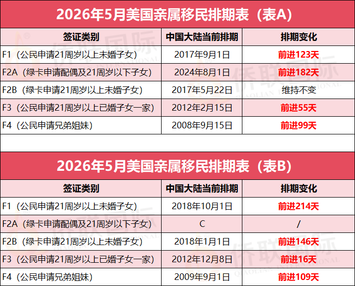 需特别提醒的是:5月职业移民表B关停! 这意味着,计划在5月提交I-485身份转换申请的申请人,只能参考表A排期进度了。