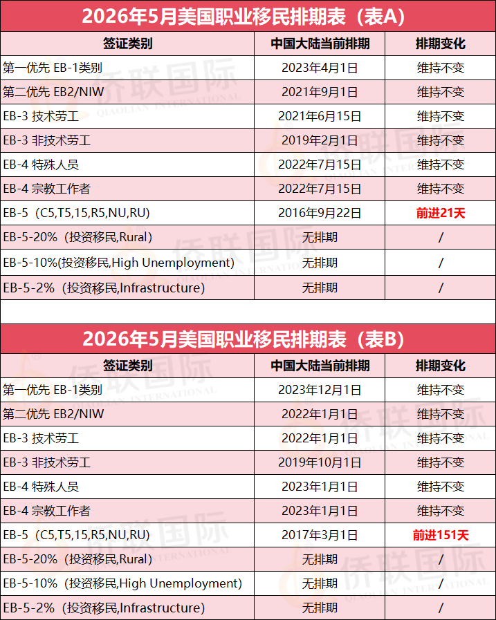 2026年5月,职业移民表A各类别中,EB-5旧政前进21天,排期来到2016年9月22日;EB-1,EB-2,EB-3等其他职业类别均维持不变。