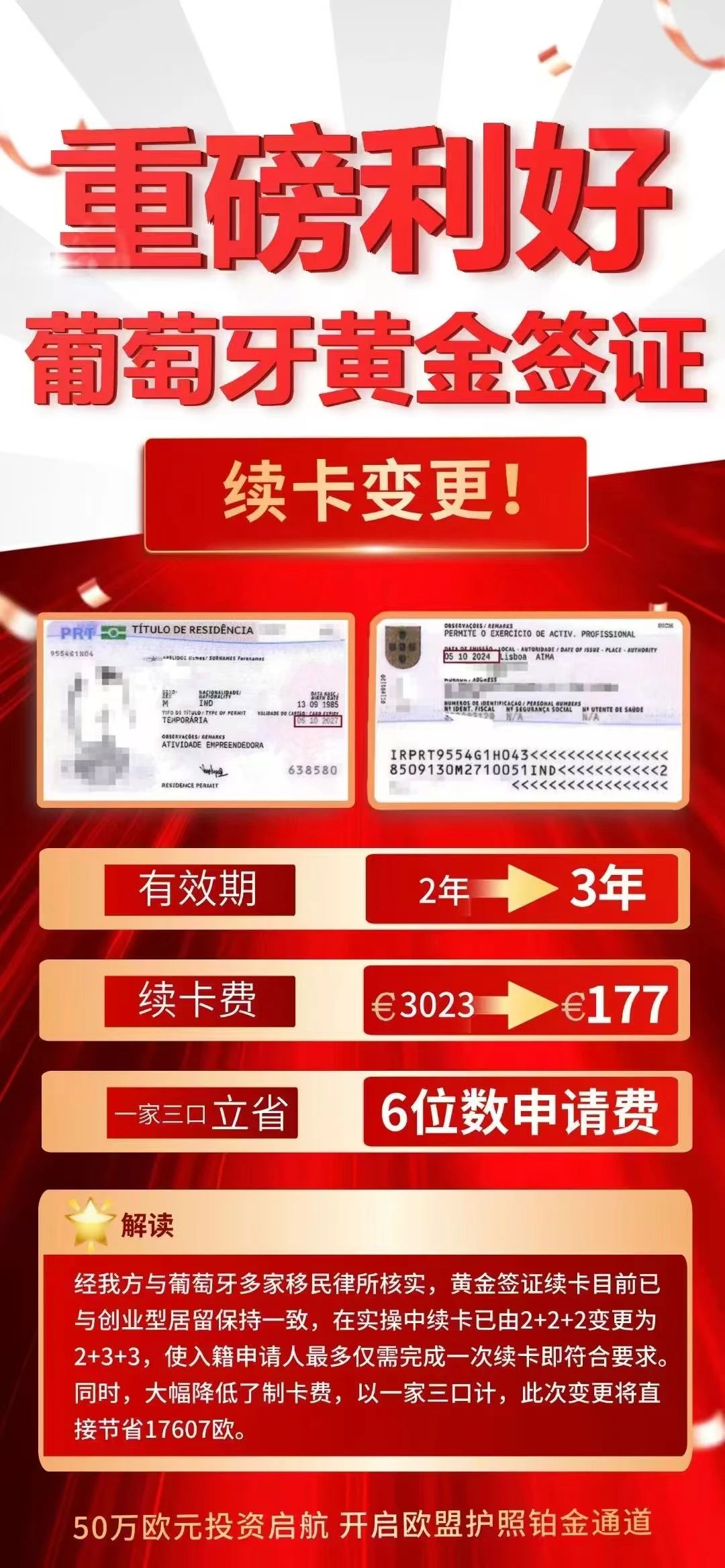 从2024年9月起,葡萄牙黄金签证居留卡的有效期从原来的2年改为3年,续卡费由3023欧元改为177欧元。