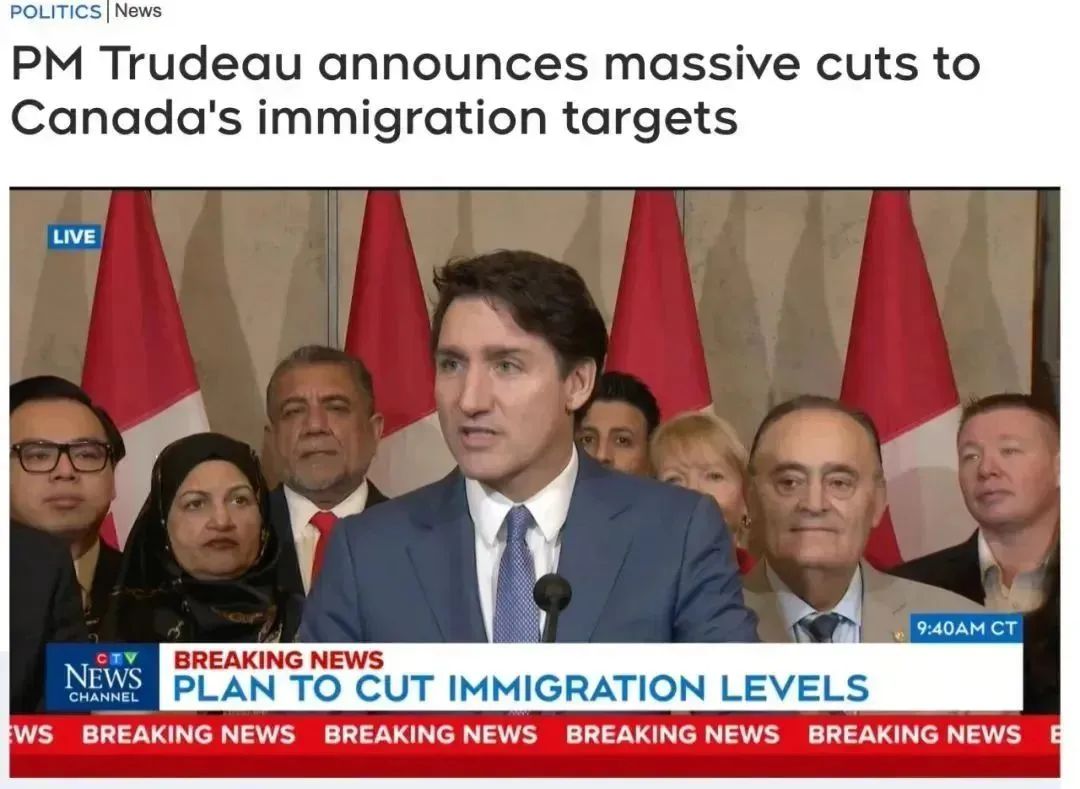 特鲁多政府于10月24日宣布大幅削减移民计划。政策中将永久居民的年度接纳人数从今年的48.5万人调降至2025年的39.5万人,降幅达到21%。