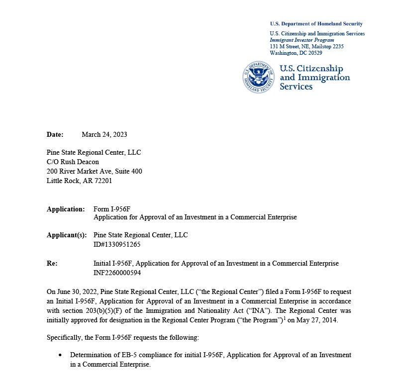 当地时间2023年3月24日,松州区域中心(Pine State Regional Center)收到美国移民局IIUSA正式书面信函告知其于去年6月递交的I-956F申请已成功获批。