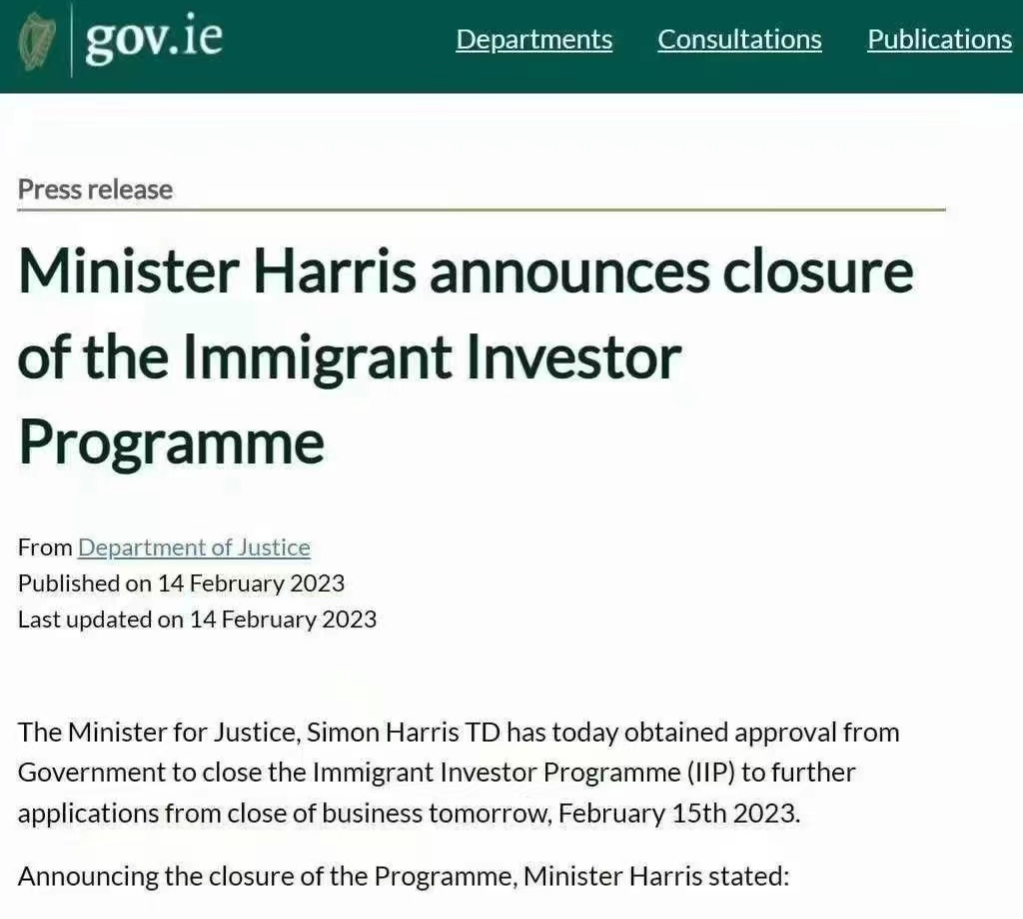 2月14日傍晚,爱尔兰官方网站正式发布通告,爱尔兰投资移民计划(IIP)将在2023年2月15日工作日结束后正式关停!