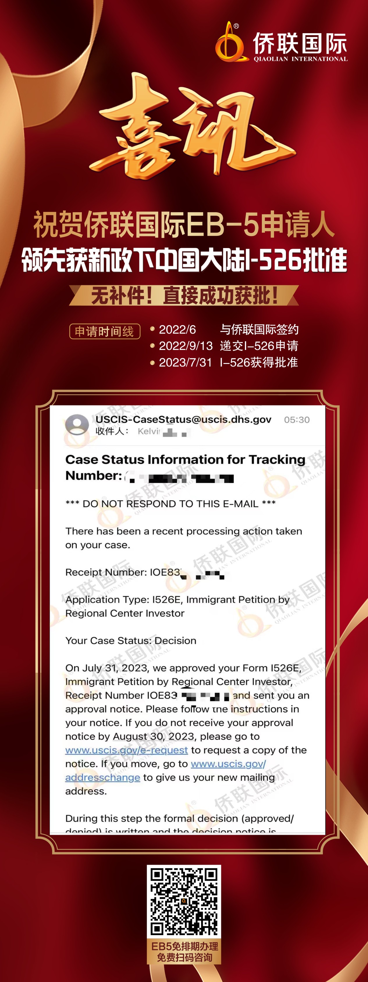 恭喜侨联国际EB-5新政客户领先获中国大陆I-526批准!