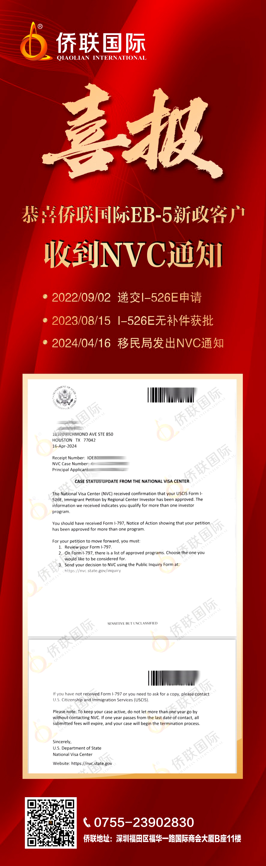 恭喜侨联国际EB-5新政客户收到NVC通知!