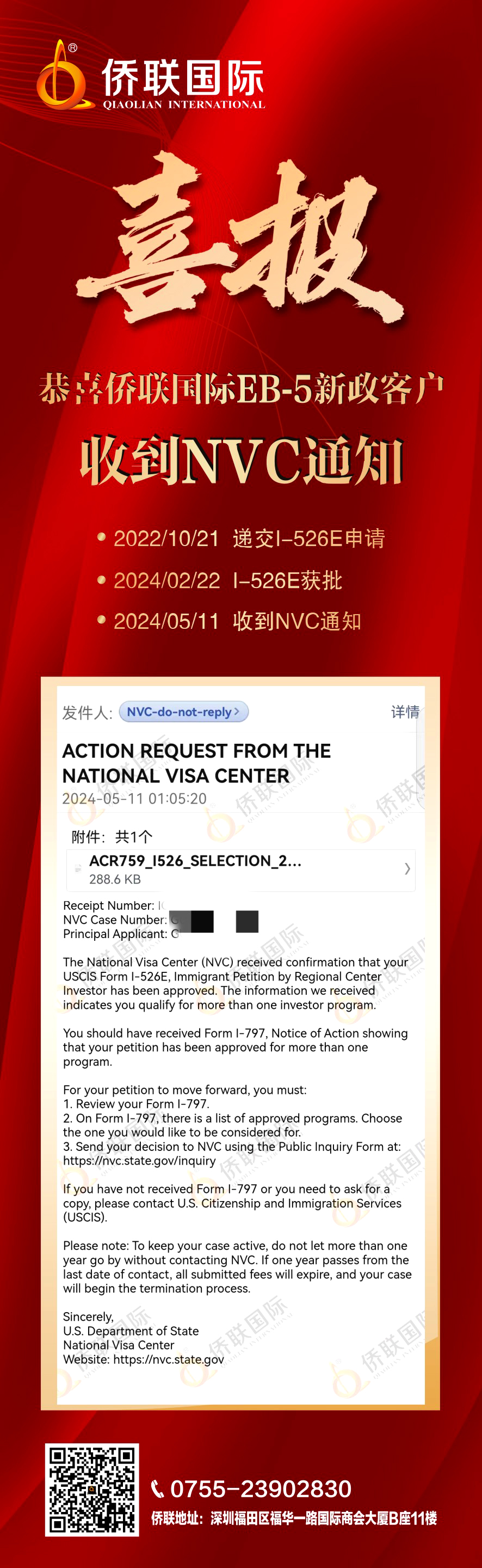 恭喜侨联国际EB-5新政客户收到NVC通知!