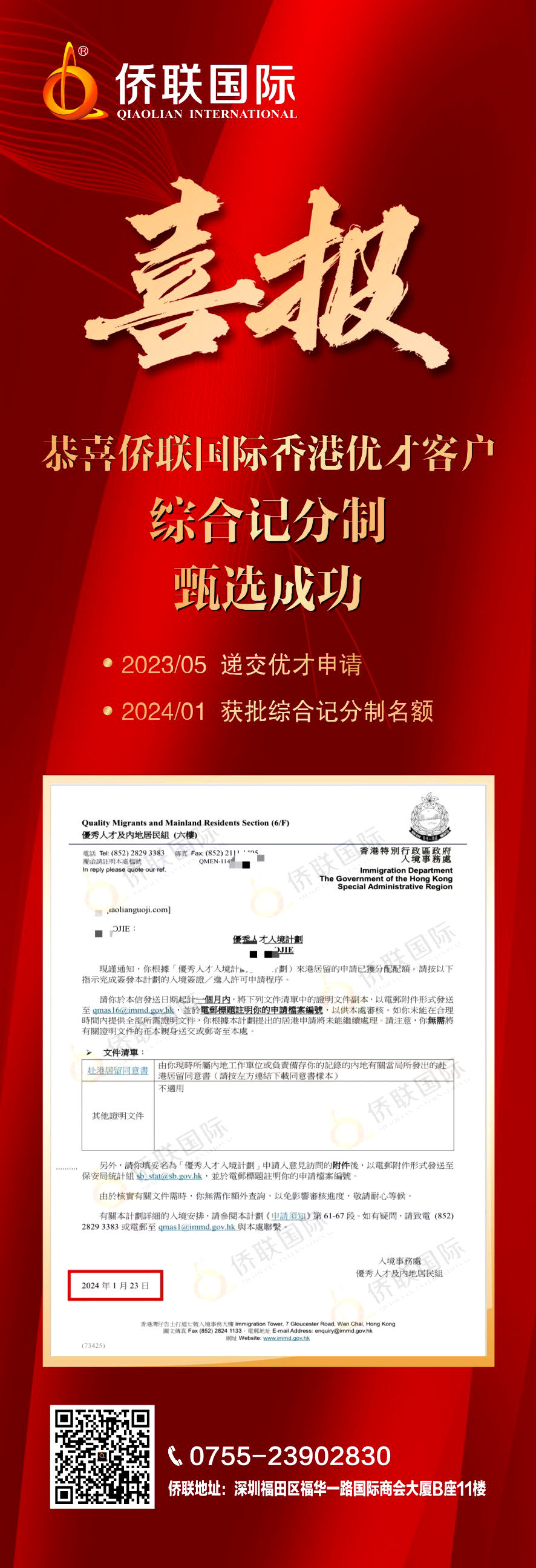 恭喜侨联国际香港优才客户综合记分制甄选成功!