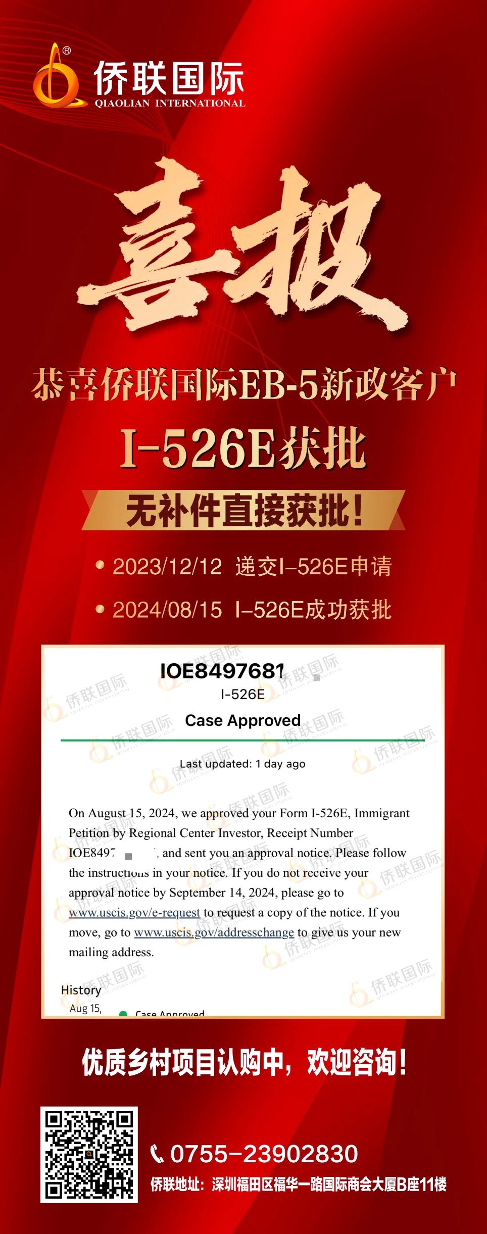 恭喜侨联国际EB-5新政客户I-526E无补件获批!