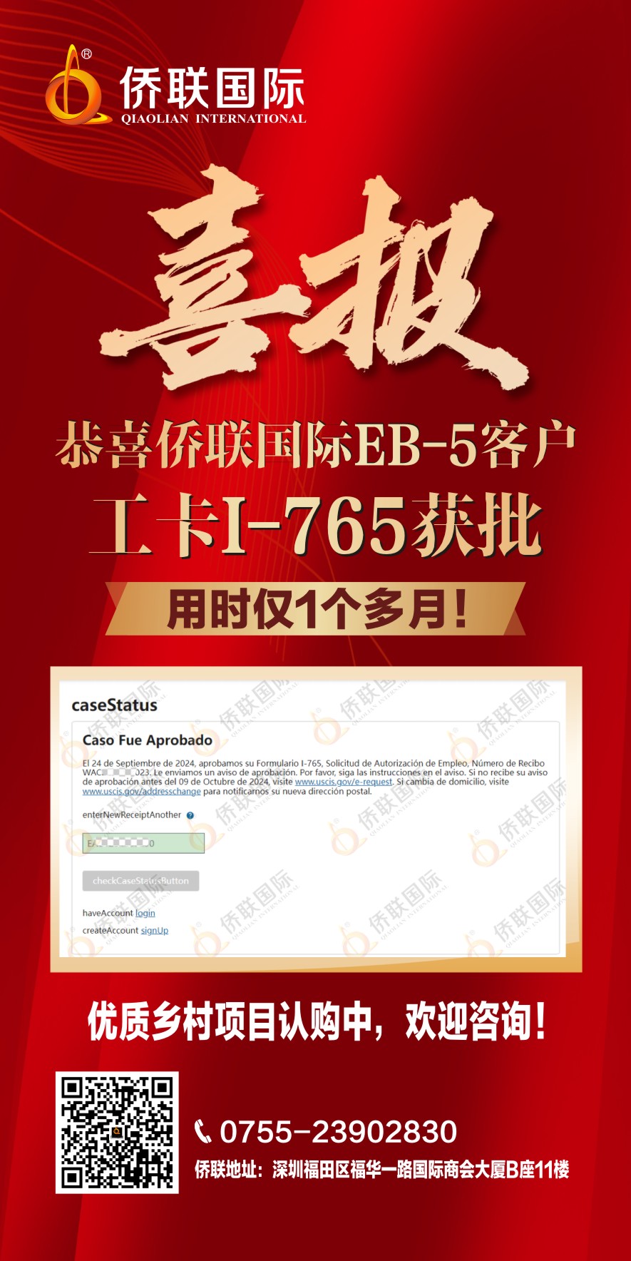 恭喜侨联国际EB-5客户工卡I-765获批,用时仅1个多月!