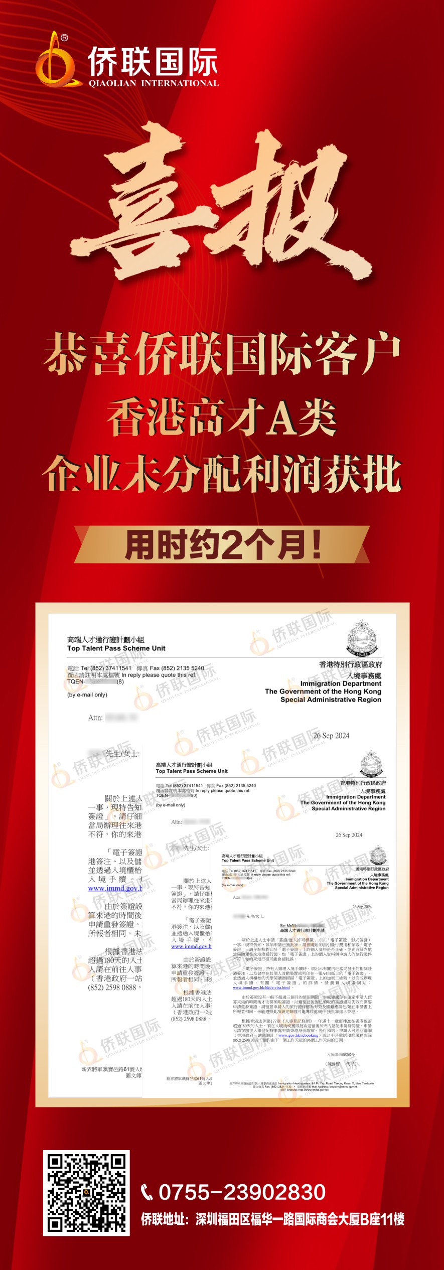 恭喜侨联国际客户香港高才A类企业未分配利润获批!
