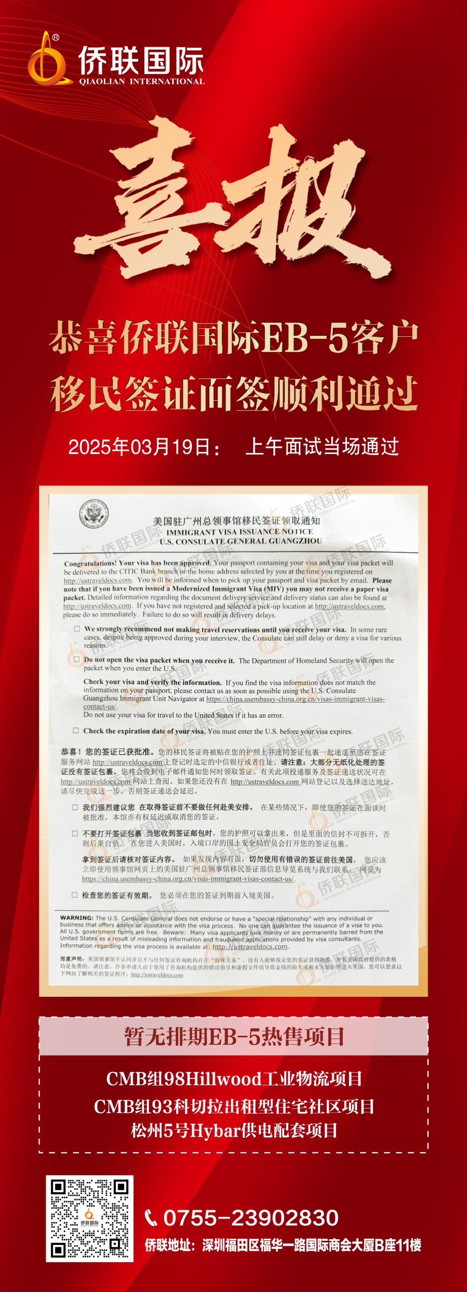 恭喜侨联国际EB-5客户移民签证面签顺利通过
